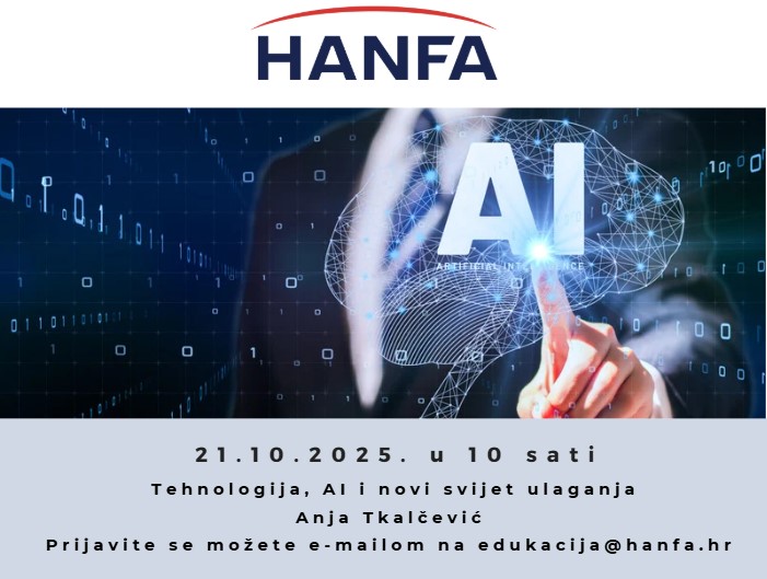 Hrvatska agencija za nadzor financijskih usluga (Hanfa) održat će 21. listopada 2025. u 10 sati online edukativno predavanje Tehnologija, AI i novi svijet ulaganja. Na taj će način Hanfa obilježiti Svjetski tjedan ulagatelja 2025. (World Investor Week – WIW), globalnu inicijativu koju koordinira Međunarodna organizacija komisija za vrijednosne papire (IOSCO).