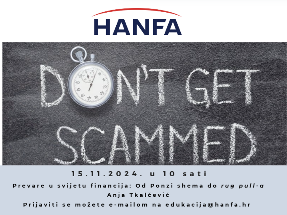 S obzirom na sve veći broj financijskih prijevara koje se često šire i putem društvenih mreža pozivamo sve zainteresirane da se educiraju i tako ne postanu žrtva prijevare. Dovoljno je izvršiti prijavu na e-mail: edukacija@hanfa.hr, nakon čega će stići odgovor s uputom za online praćenje predavanja.