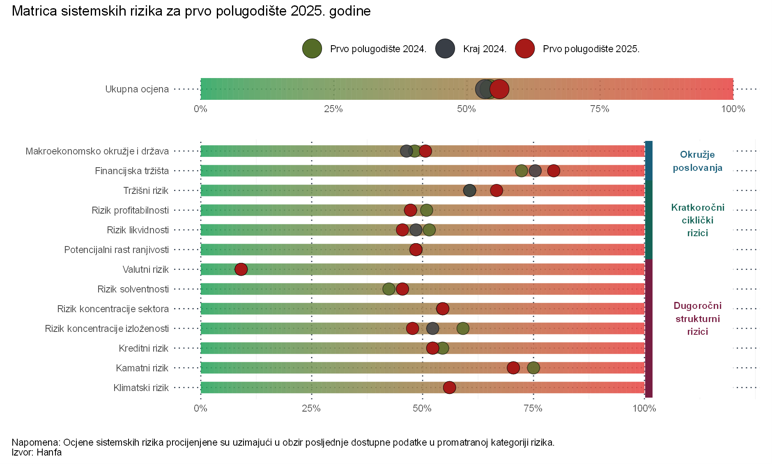 U prvom polugodištu 2025. razina sistemskih rizika u sektoru financijskih usluga ostala je povišena, unatoč nastavku gospodarskog rasta i stabilnim fiskalnim izgledima. Glavni izvori rizika i dalje su povišeni inflacijski pritisci i nastavak rasta cijena na tržištu nekretnina, koji povećavaju ranjivost makroekonomskog okružja.