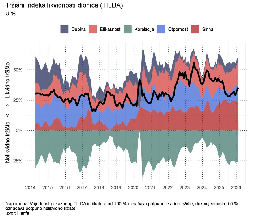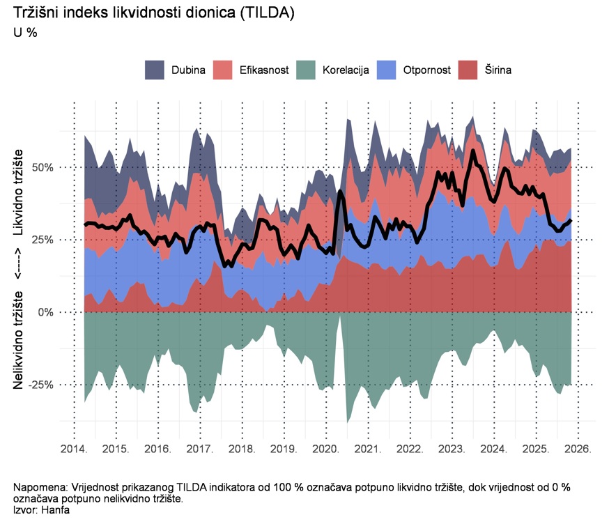 Financijski sustav centralni je dio gospodarstva čija uloga financijskog posredništva od štediša (institucija i pojedinaca s neto viškom financijskih sredstava) prema dužnicima (novčano deficitarni ekonomski agenti) potpomaže gospodarski rast i razvoj kroz efikasnu alokaciju kapitala prema aktivnostima koje stvaraju dodatnu vrijednost. Strukturni pokazatelji tržišta kapitala posebno su važni za ulagatelje, ali i regulatore jer upućuju na snagu tržišta da podnese iznenadne sistemske šokove. Iako je pojam likvidnosti tržišta kapitala u teoriji intuitivan i lako razumljiv, u praksi se ispod krovnog pojma tržišne likvidnosti krije nekoliko različitih koncepata, odnosno karakteristika tržišta. Likvidnost domaćeg tržišta kapitala moguće je analizirati praćenjem kompozitnoga tržišnog indikatora likvidnosti domaćeg dioničkog tržišta (TILDA).