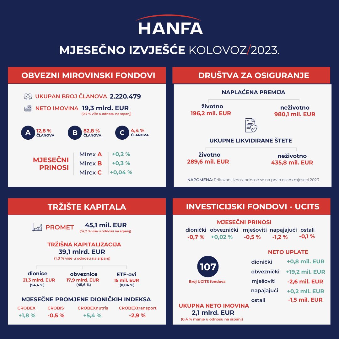 U kolovozu 2023. poslovalo je ukupno 107 UCITS fondova, dva manje nego u prethodnom mjesecu jer su jedan obveznički i jedan fond iz kategorije „ostali“ prestali s radom. Ukupna neto imovina UCITS fondova na kraju mjeseca iznosila je 2,1 mlrd. EUR te je bila za 7,5 mil. EUR ili 0,4 % manja u odnosu na prethodni mjesec. Ukupne mjesečne neto uplate svih UCITS fondova u kolovozu su bile pozitivne i iznosile su 16,1 mil. EUR. Negativne neto uplate ostvarili su mješoviti fondovi (-2,6 mil. EUR) i fondovi iz kategorije „ostali“ (-1,5 mil. EUR). Pozitivne neto uplate ostvarili su obveznički fondovi (19,2 mil. EUR), dionički fondovi (0,8 mil. EUR) i napajajući fondovi (0,2 mil. EUR). Neto imovina obvezničkih fondova na kraju kolovoza činila je 40,5 % ukupne neto imovine svih UCITS fondova, dok su dionički i mješoviti fondovi činili 16,3 % odnosno 13,4 % ukupne neto imovine UCITS fondova. U kolovozu 2023. negativan prosječni mjesečni prinos ponderiran imovinom imale su gotovo sve vrste UCITS fondova, i to dionički -0,7 %, napajajući -1,2 %, mješoviti -0,5 %, ostali -0,1 %, dok su pozitivni bili jedino obveznički fondovi s 0,02 %.