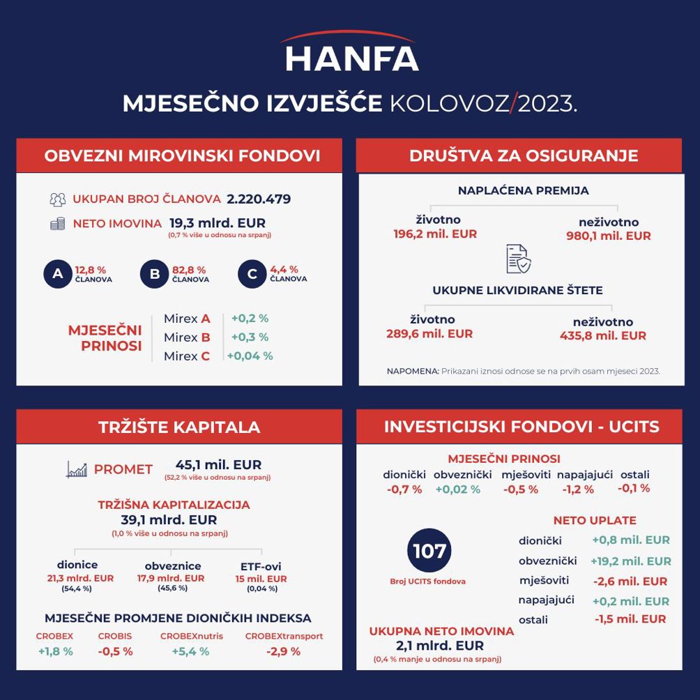Obvezni mirovinski fondovi (OMF) imali su na kraju kolovoza 2023. ukupno 2.220.479 članova, odnosno 9.820 članova (0,44 %) više u odnosu na prethodni mjesec. Pritom se u B kategoriji nalazilo 82,8 %, u A kategoriji 12,8 % te u C kategoriji 4,4 % ukupnog broja članova OMF-ova. Od ukupno 10.860 novih članova u kolovozu njih 10.658 (98,1 %) automatizmom je rasporedio Regos. Zbog odlaska u mirovinu ili smrti u kolovozu je prestalo članstvo za 1.040 osiguranika. Ukupni neto doprinosi uplaćeni u OMF-ove u kolovozu iznosili su 108,6 mil. EUR (0,6 % neto imovine s kraja srpnja). Istovremeno su ukupni iznosi isplata po zatvaranju osobnih računa iz svih OMF-ova iznosili 19,1 mil. EUR (0,1 % neto imovine s kraja srpnja), što je za 9.4 mil. EUR manje u odnosu na prethodni mjesec.