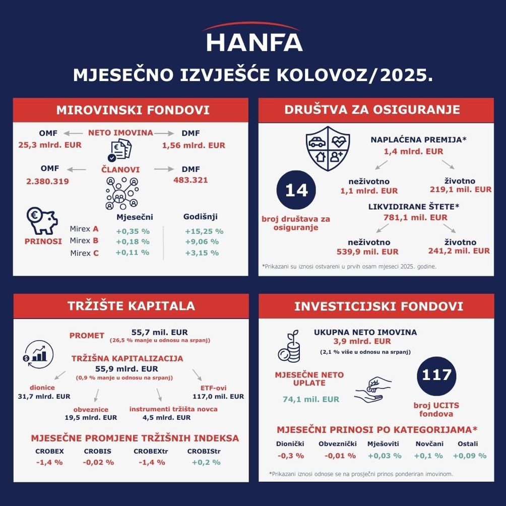 Na kraju kolovoza 2025. broj članova 8 otvorenih dobrovoljnih mirovinskih fondova (ODMF) povećao se za 0,3 % na mjesečnoj razini, a broj članova 21 zatvorenog dobrovoljnog mirovinskog fonda (ZDMF) za 0,2 % te su spomenuti fondovi imali 432.986 (ODMF), odnosno 50.335 članova (ZDMF). Ukupne uplate u dobrovoljne mirovinske fondove (DMF) u kolovozu 2025. iznosile su 9,8 mil. EUR (0,6 % neto imovine s kraja prethodnog mjeseca), što je za 15,6 % manje u odnosu na prethodni mjesec. Ukupne isplate iz DMF-ova u kolovozu 2025. iznosile su 3,9 mil. EUR, što je na mjesečnoj razini manje za 7,9 %. Isplate zbog umirovljenja i ostalih razloga činile su 72,4 %, isplate zbog promjene fonda 23,9 %, a isplate zbog smrti 3,7 % ukupnih isplata u kolovozu. Kod ukupnih isplata zbog umirovljenja 1,7 mil. EUR isplaćeno je putem društva (fonda), 0,8 mil. EUR u obliku jednokratnih isplata, a 0,4 mil. EUR transferirano je u mirovinska osiguravajuća društva (MOD-ove). Neto imovina DMF-ova u kolovozu povećala se za 4,9 mil. EUR (0,3 % na mjesečnoj razini) te je iznosila 1,56 mlrd. EUR. Mjesečni nominalni prinosi DMF-ova u kolovozu su se kretali između -0,6 % i 0,3 %, a prinosi na godišnjoj razini od 2,4 % do 13,7 %. Kod strukture ulaganja DMF-ova najveći dio portfelja čine obveznice (53,0 % imovine), a zatim dionice (27,4 %) te investicijski fondovi (10,4 %). Udio obveznica u ulaganjima DMF-ova smanjio se na mjesečnoj razini za 0,2 p.b., udio ulaganja u investicijske fondove manji je za 0,1 p.b., dok je udio dionica porastao za 0,1 p.b.
