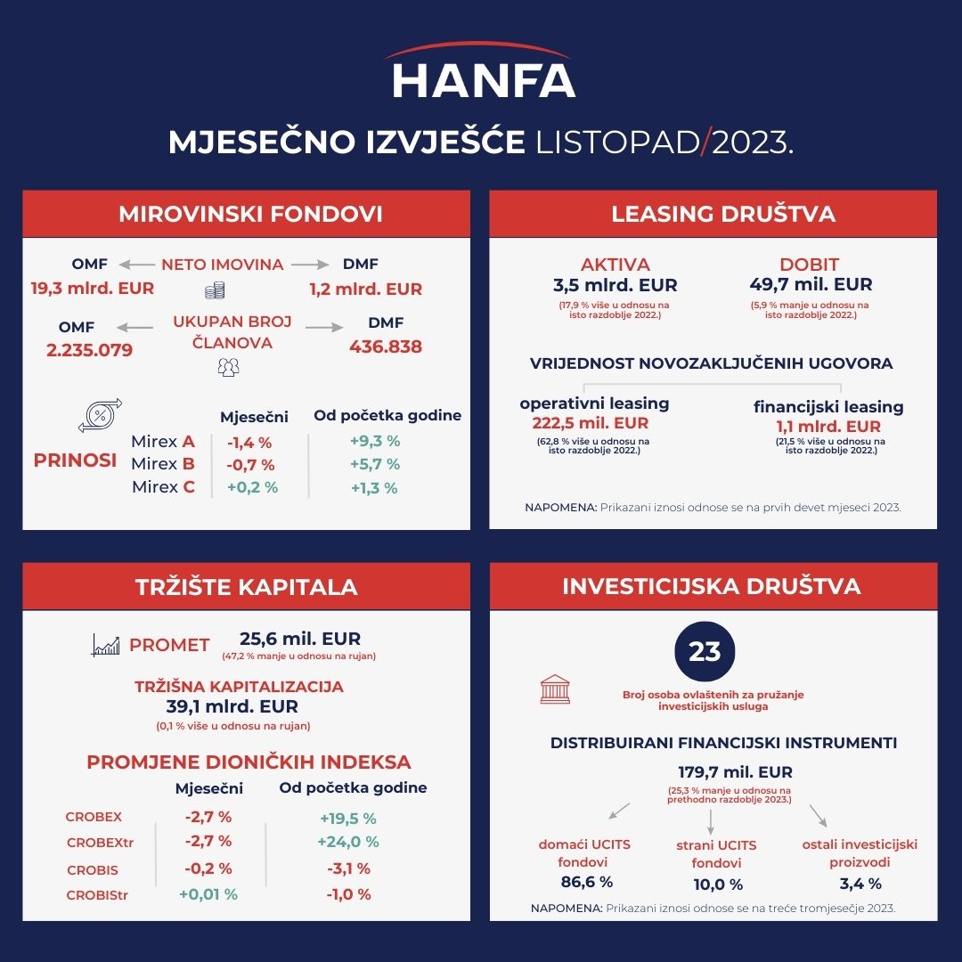 Neto imovina OMF-ova na kraju listopada 2023. iznosila je 19,3 mlrd. EUR, što je za 59,9 mil. EUR (0,3 %) manje u odnosu na prethodni mjesec. Na kraju listopada nominalni mjesečni prinosi Mirexa iznosili su -1,4 % za kategoriju A, -0,7 % za kategoriju B i 0,2 % za kategoriju C. Godišnji prinosi Mirexa iznosili su 10,5 % za kategoriju A, 5,9 % za kategoriju B i 2,0 % za kategoriju C, a anualizirani[1] prinosi od početka rada OMF-ova iznosili su 6,7 % za Mirex A, 5,1 % za Mirex B i 3,1 % za Mirex C[2].