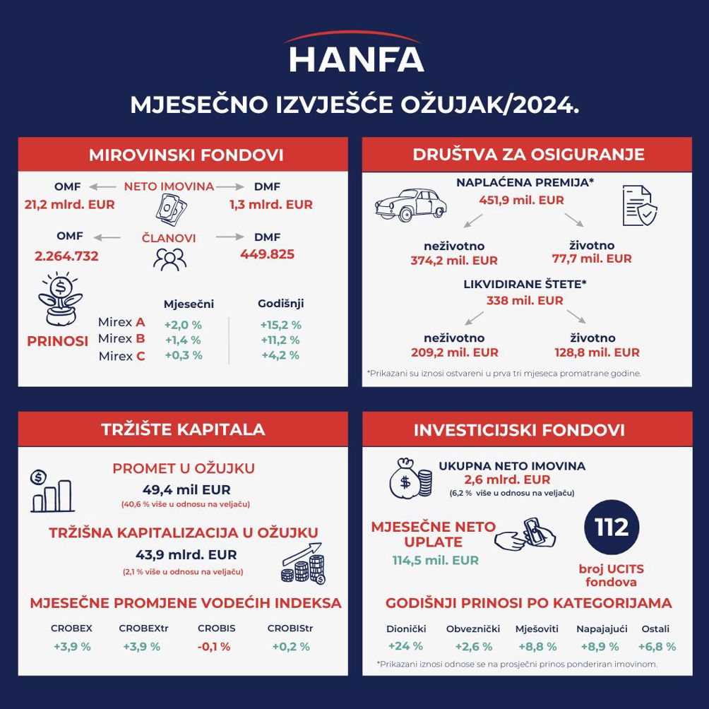 Na kraju ožujka 2024. broj članova 8 otvorenih dobrovoljnih mirovinskih fondova (ODMF) povećao se za 0,5 % na mjesečnoj razini, a broj članova 21 zatvorenog dobrovoljnog mirovinskog fonda (ZDMF) za 0,3 %, čime su spomenuti fondovi na kraju mjeseca imali 400.916 (ODMF) odnosno 48.909 članova (ZDMF). Ukupne uplate u dobrovoljne mirovinske fondove (DMF) u ožujku 2024. iznosile su 10,1 mil. EUR (0,8 % neto imovine s kraja prethodnog mjeseca), što je smanjenje od 3,0 % u odnosu na prethodni mjesec. Ukupne isplate iz DMF-ova u ožujku 2024. iznosile su 4,7 mil. EUR, što je za 1,7 mil. EUR (26,2 %) manje od isplata u prethodnom mjesecu. Ukupne isplate zbog umirovljenja i ostalih razloga činile su 72,6 %, isplate zbog promjene fonda 22,9 %, a isplate zbog smrti 3,5 % ukupnih isplata u ožujku. Kod ukupnih isplata zbog umirovljenja 1,4 mil. EUR isplaćeno je putem mirovinskog društva (fonda), 1,2 mil. EUR u obliku jednokratnih isplata, a 0,8 mil. EUR transferirano je u mirovinska osiguravajuća društva (MOD-ove).