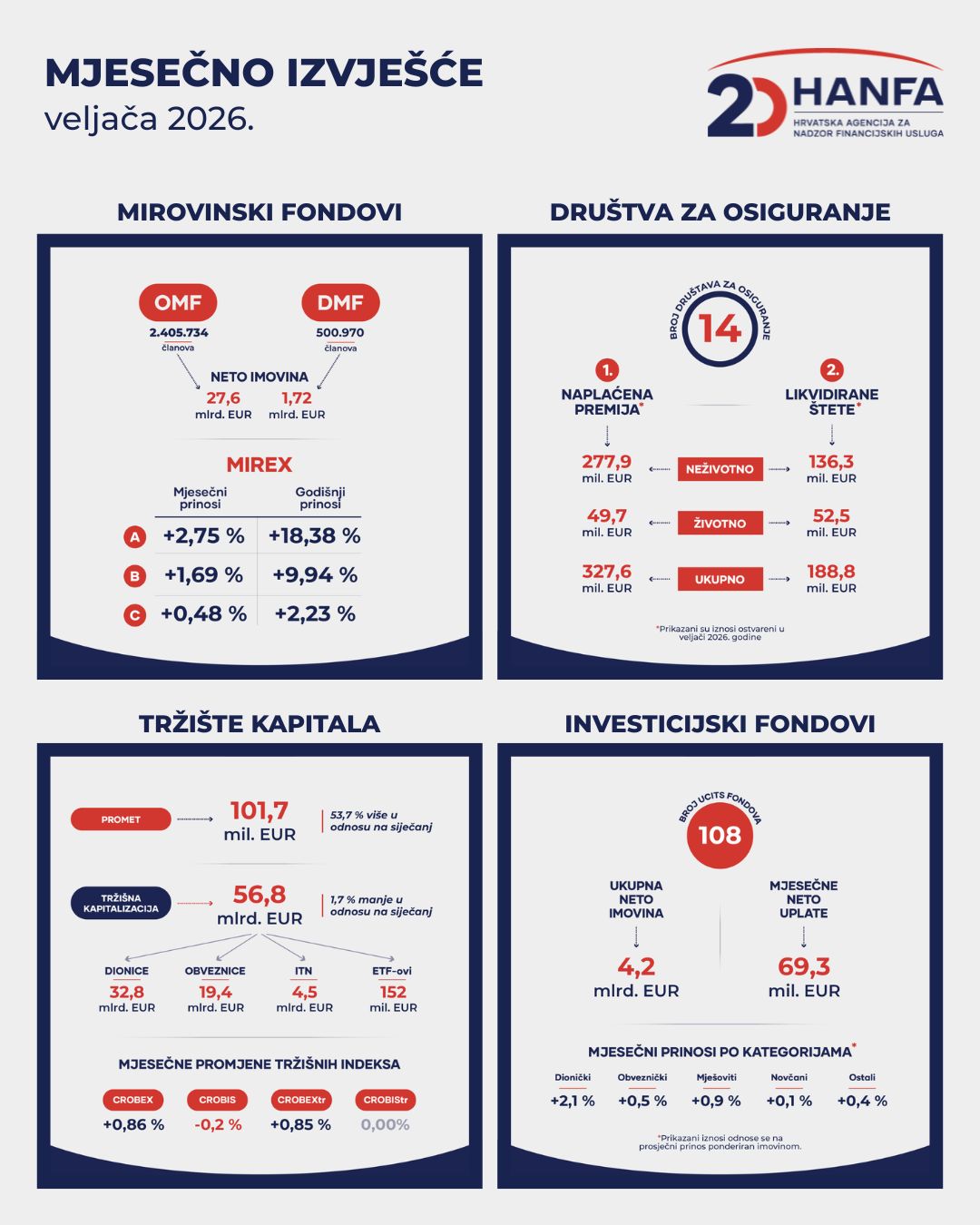 Neto imovina OMF-ova na kraju veljače 2026. iznosila je 27,6 mlrd. EUR, što je za 549,5 mil. EUR (2,0 %) više nego u prethodnom mjesecu. Na kraju veljače nominalni mjesečni prinosi Mirexa iznosili su 2,75 % za kategoriju A[1],1,69 % za kategoriju B i 0,48 % za kategoriju C. Na godišnjoj su razini prinosi Mirexa iznosili 18,38 % za kategoriju A, 9,94 % za kategoriju B i 2,23 % za kategoriju C, a anualizirani[2] prinosi od početka rada OMF-ova iznosili su 8,88 % za Mirex A, 5,66 % za Mirex B i 3,26 % za Mirex C[3].