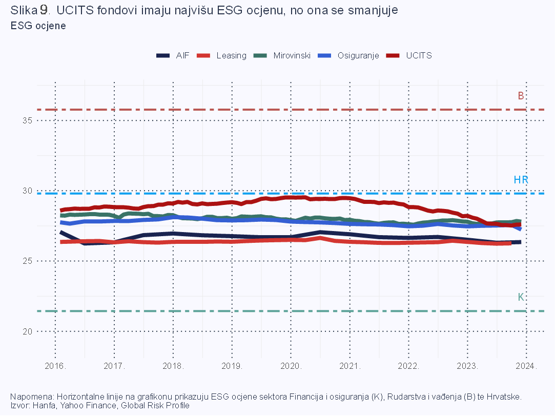 [1] Izloženost domaćeg sektora financijskih usluga klimatskim rizicima aproksimirana je pomoću ponderirane prosječne ESG ocjene pojedinačnih izloženosti, pri čemu je ponder jednak udjelu izloženosti u ukupnim ulaganjima. Svakoj pojedinačnoj izloženosti dodijeljena je prosječna ESG ocjena na temelju presjeka djelatnosti i države kao protustrane.