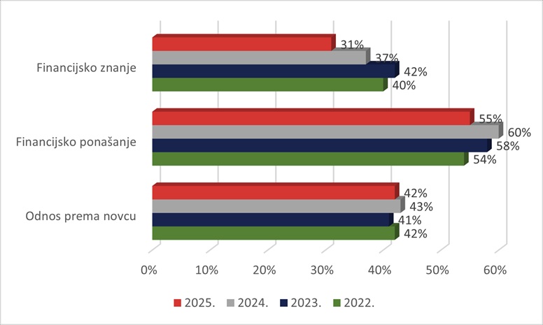 Grafikon 1: Usporedba komponenti financijske pismenosti učenika srednjih škola u 2022., 2023., 2024. i 2025.