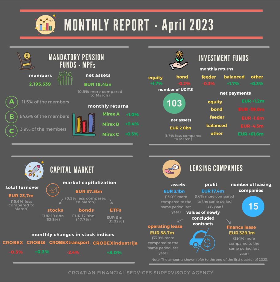 In April 2023, there were 103 UCITS operating on the market, three more than in the previous month. Their total net assets amounted to EUR 1.98bn at the end of the month, decreasing by EUR 34.0m or 1.7% compared to the previous month. Total monthly net payments of all UCITS were positive and reached EUR 17.8m. Negative monthly net payments were recorded by bond funds (EUR -39.0m), balanced funds (EUR -4.3m) and feeder funds (EUR -1.6m). Positive monthly net payments were recorded by equity funds (EUR 1.2m) and funds categorised as “other” (EUR 61.6m). Bond funds’ net assets accounted for 44.1% of UCITS total net assets at the end of April, while equity and balanced funds accounted for 15.0% and 14.2% of UCITS total net assets respectively. In April 2023, positive asset-weighted average monthly returns were generated by equity (1.7%), balanced (1.7%) and other UCITS (0.3%), while negative returns were recorded by bond (-0.2%) and feeder (-0.3%) UCITS.