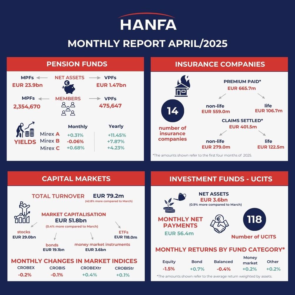 In April 2025, there were 14 insurance companies operating on the market. The total premium collected in the first four months of 2025 amounted to EUR 665.7m, i.e., 9.6% more that in the same period in 2024. EUR 106.7m (16.0%) of this amount related to life insurance premium (2.2% more than in the same period last year), while EUR 559.0m (84.40%) related to non-life insurance premium (11.1% more at an annual level). The structure of the non-life insurance premium collected is dominated by motor vehicle liability insurance (35.3%), followed by insurance of road vehicles (19.5%), insurance against fire and natural disasters (9.5%) and health insurance (9.3%). The amount of claims settled in the first four months of 2025 reached EUR 401.5m, decreasing by 10.2% compared to same period in 2024. EUR 122.5m (30.5%) of this amount related to life insurance (29.3% less at an annual level), while EUR 279.0m (69.5%) related to non-life insurance (2.0% more compared to the same period in 2024). In the total amount of claims settled in non-life insurance, the largest amounts related to motor vehicle liability insurance (42.7%), insurance of road vehicles (21.4%), health insurance (12.3%), and insurance against fire and natural disasters (7.0%).