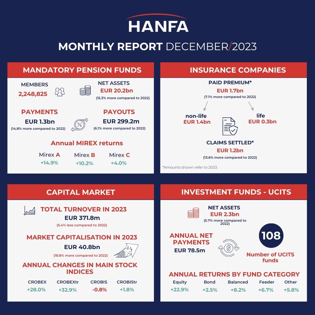 In December 2023, there were 108 UCITS operating on the market, 5 less than in the previous month. Total net assets of UCITS amounted to EUR 2.3bn at the end of the month, increasing by EUR 153.3m or 7.2% compared to the previous month. Compared to the end of the previous year, net assets of all UCITS increased by EUR 123.0m (5.7%). Total net payments of all UCITS in December were negative (EUR -118.4m). Positive monthly net payments were recorded by bond funds (EUR 89.9m), equity funds (EUR 19.7m), money market funds (EUR 6.9m), and funds categorised as “other funds” (EUR 5.9m), while negative monthly net payments were recorded by balanced funds (EUR -3.6m) and feeder funds (EUR -0.3m). Net payments to UCITS on the annual basis were also positive, amounting to EUR 78.5m. Broken down by categories, positive annual net payments were recorded by funds categorised as “other funds” (EUR 270.6m), equity funds (EUR 49.1m) and money market funds (EUR 10.5m), while negative annual net payments were recorded by feeder funds (EUR -13.2m), balanced funds (EUR -42.1m) and bond funds (EUR -193.3m). Bond funds’ net assets accounted for 40.5% of the total net assets of all UCITS at the end of December, while equity and balanced funds accounted for 15.8% and 11.6% of the total net assets of UCITS respectively. In December 2023, all categories of UCITS recorded positive asset-weighted average monthly returns, namely equity funds 3.3%, feeder funds 3.7%, balanced funds 2.3%, “other“ funds 1.6 %, bond funds 1.1% and money market funds 0.3%. Average annual returns of all UCITS categories were also positive, amounting to 22.9% for equity funds, 6.7% for feeder funds, 8.2% for balanced funds, 5.8% for “other” funds and 2.5% for bond funds.