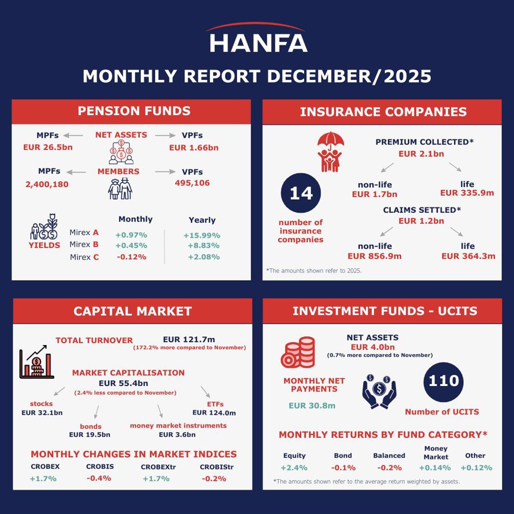 At the end of December 2025, the number of members of 8 open-ended voluntary pension funds (OVPFs) rose by 0.96% on a monthly basis, while the number of members of 21 closed-ended voluntary pension funds (CVPFs) increased by 0.67%, making the number of members of these funds reach 444,107 and 50,999 respectively. Total monthly payments made to voluntary pension funds (VPFs) in December 2025 amounted to EUR 48.9m (3.0% of net assets at end-November), increasing by 249.6% compared to the previous month. The reason for such large monthly change is the payment of government incentives, which are always paid in December. Total payments made from these funds reached EUR 5.7m, increasing by 25.6% on a monthly basis. Total payments from VPFs made due to retirement and other reasons accounted for 67.1%, payments made due to the change of fund reached 25.7%, while those made due to death accounted for 7.2% of total payments in December. As regards total payments made due to retirement, the amount of EUR 1.8m was paid through a pension company (fund), the amount of EUR 1.0m was paid in the form of lump-sum payments, while the amount of EUR 0.9m was transferred for payment to pension insurance companies.