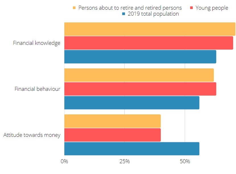The overall score of financial literacy of citizens aged 50-65 was 12.2 out of a maximum of 20 points. This shows that respondents gave an accurate, i.e. desirable answer to a total of 61% of the questions on average, which is 2 percentage points higher than the financial literacy of all adult Croatian citizens according to the 2019 OECD survey. The life experience of respondents is reflected in the achieved high score of their financial knowledge and knowledge of basic financial terms and services (71%). However, high theoretical knowledge of the world of finance is not accompanied by equally high and responsible financial behaviour (62%) and the attitude towards money (40%), and similar relationships are also observed for the total population (Figure 1). The relatively low rating of the level of financial behaviour in relation to knowledge can be explained by the fact that financial behaviour is also influenced by the individual's financial situation. For example, despite the fact that 62% of respondents plan their monthly budget, and 78% of them ponder before purchasing whether they can afford a particular product or service, as many as 44% of respondents are not immune to financial shocks and would not be able to cover the unexpected expense in the amount of their monthly income. It is therefore important to point out that these results reflect not only the subjective perception of money and financial management, but also objective circumstances, primarily in view of the insufficient level of average pension income of only around 40% of the average salary, which prevents pensioners from managing their finances more appropriately through e.g. active savings and ensuring financial resilience to shocks.