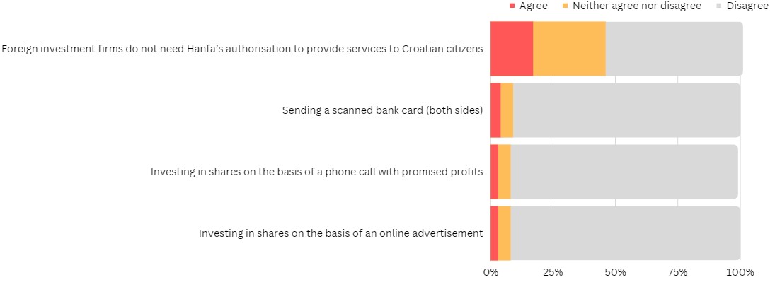 It is therefore extremely important to alert and inform citizens about the types and forms of fraud and the signs indicating it. Hanfa has published a series of warnings and educational materials related to financial fraud. It is also important to inform citizens about who they can turn to if they have been the victim of financial fraud or had disputes with companies, as more than half of the respondents are uncertain about whom to appeal in case of disputes with the institution providing them with a financial service.