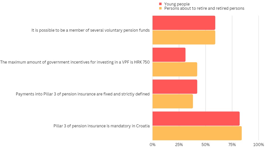 Only a minority of citizens rely on other pension savings options when planning their retirement, notably voluntary pension savings. While a very high proportion of citizens (84%) know that there is an additional third pension pillar and that it is voluntary, 43% of those in the pension planning phase pay into voluntary pension savings or their employer does so for them. The largest share of persons saving in the third pillar save between HRK 400 and 600 per month[4], which is required to receive the full amount of government incentives. This is likely due to insufficient awareness of the characteristics of the third pillar, such as the flexibility of payments. Although persons about to retire and retired are better acquainted with government incentives for voluntary pension savings when compared to young people, more than 50% still do not know what the maximum amount of these incentives is.