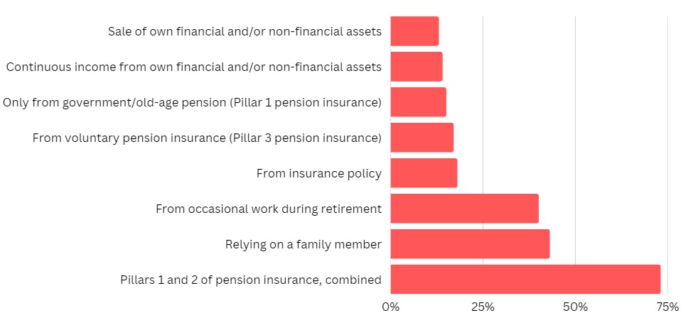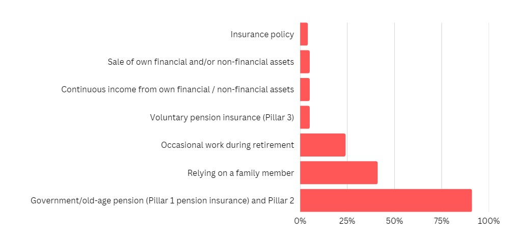 People who are still in the phase of planning and saving for retirement also do not think enough about other sources of income besides mandatory pension insurance. This is particularly interesting since the largest number of respondents think that their monthly income after retirement, which would be sufficient for a comfortable lifestyle, should be between HRK 5,000 and 7,000[3], which is almost twice the current average pension. This difference between the pension income and the amount needed for a comfortable living in retirement is one of the reasons why as many as 40% of persons about to retire plan to continue working even after retirement. In addition to occasional work, 43% of respondents plan to rely financially on a family member, which is also linked to the fact that 64% believe that they will not have sufficient amount of pension from formal sources for adequate living, and 40% think that they will depend on or already depend on someone else's help.