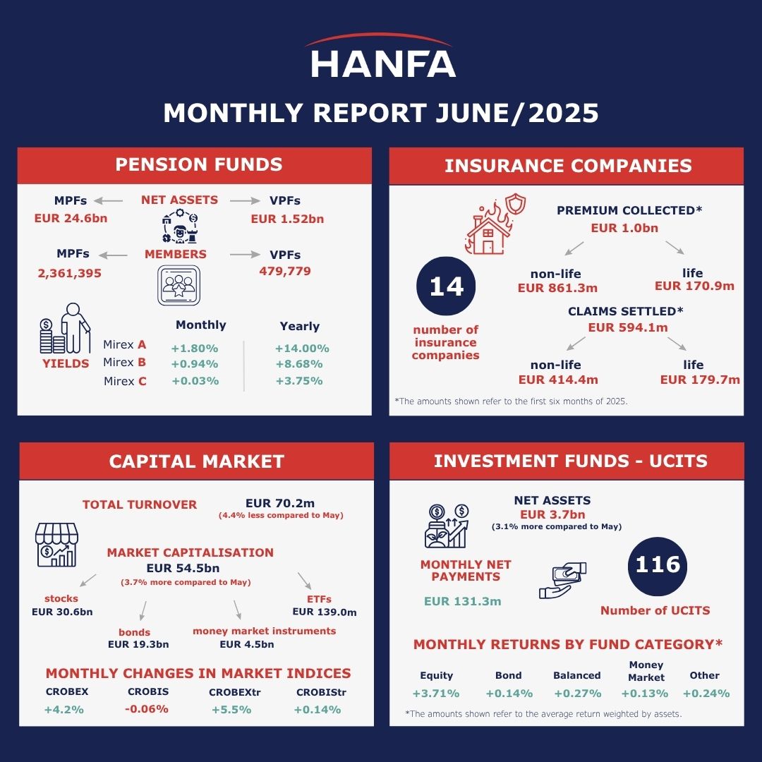 In June 2025, there were 14 insurance companies operating on the market. The total premium collected in the first six months of 2025 amounted to EUR 1.0bn, i.e. 8.3% more that in the same period in 2024. EUR 170.9m (16.55%) of this amount related to life insurance premium (3.2% less than in the same period last year), while EUR 861.3m (83.45%) related to non-life insurance premium (10.9% more at an annual level). The structure of the non-life insurance premium collected is dominated by motor vehicle liability insurance (35.5%), followed by insurance of road vehicles (19.6%), insurance against fire and natural disasters (9.1%) and health insurance (8.8%). The amount of claims settled in the first six months of 2025 reached EUR 594.1m, decreasing by 9.3% compared to same period in 2024. EUR 179.7m (30.25%) of this amount related to life insurance (30.6% less at an annual level), while EUR 414.4m (69.75%) related to non-life insurance (4.8% more compared to the same period in 2024). In the total amount of claims settled in non-life insurance, the largest amounts related to motor vehicle liability insurance (41.0%), insurance of road vehicles (21.6%), health insurance (12.5%), and insurance against fire and natural disasters (8.8%).