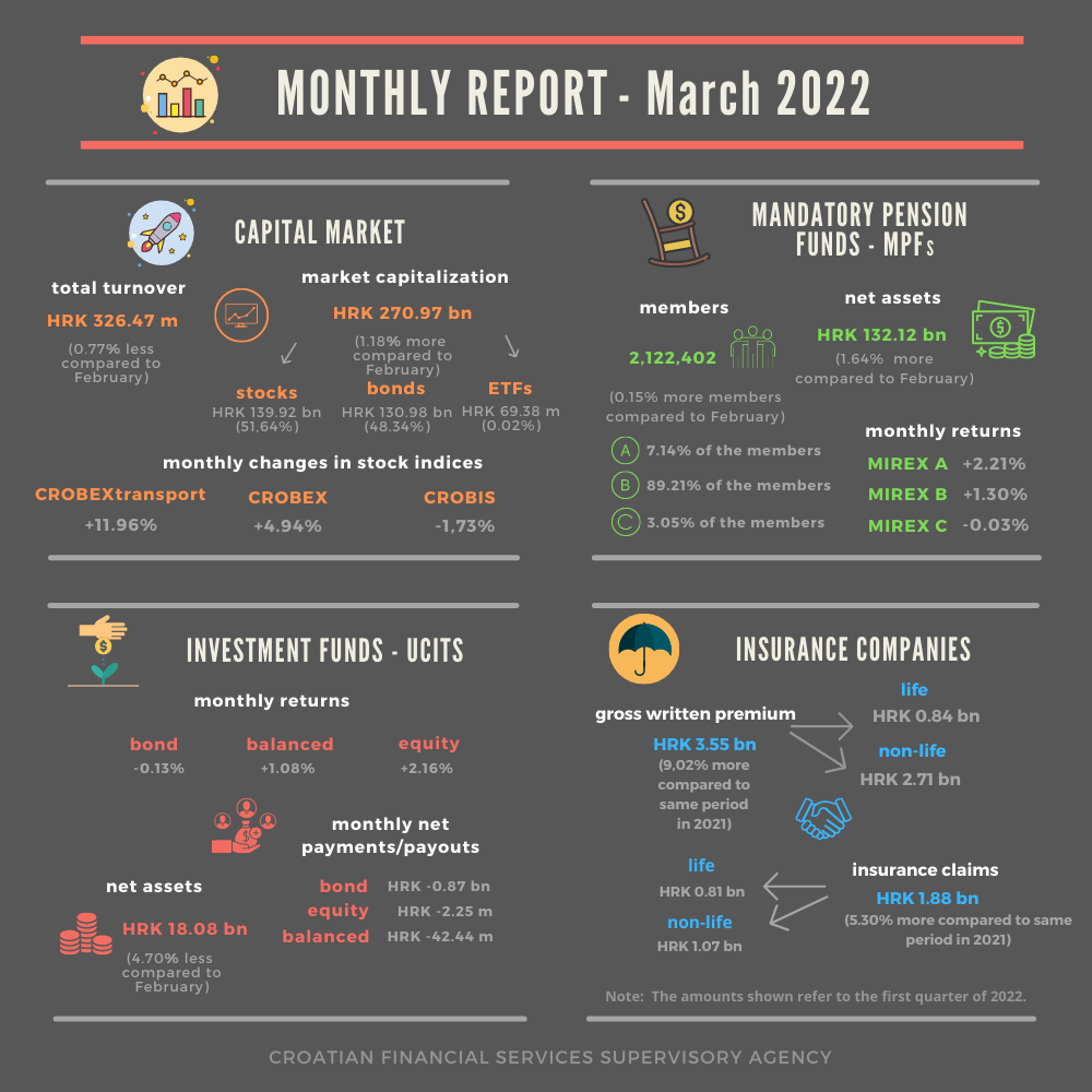 In March 2022, there were 95 UCITS operating on the market, with their total net assets amounting to HRK 18.08bn at the end of the month and decreasing by HRK 0.9bn or 4.70% compared to the previous month. Negative net outflows were recorded in March 2022 by all UCITS. Bond UCITS recorded net outflows reaching HRK -0.87bn, followed by balanced UCITS with HRK -42.44m and equity UCITS with net outflows of HRK -2.25m. Funds categorised as “other funds” and feeder UCITS recorded net outflows totalling HRK -90.33m and HRK -6.62m respectively. Bond funds’ net assets accounted for 67.8% of the total net assets of all UCITS at the end of March, while equity and balanced funds accounted for 12.3% and 7.0% of the total UCITS’ net assets respectively. Asset-weighted average monthly returns were positive for all categories of funds except bond funds, with their returns standing at -0.13%. Positive monthly returns were recorded by the following UCITS categories: equity funds (2.16%), balanced funds (1.08%), other funds (0.80%) and feeder funds (2.30%).