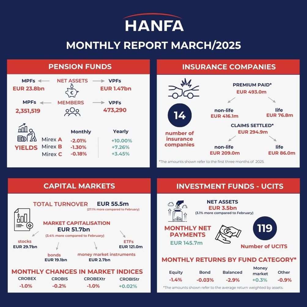 At the end of March 2025, the number of members of 8 open-ended voluntary pension funds (OVPFs) rose by 0.5% on a monthly basis, while the number of members of 21 closed-ended voluntary pension funds (CVPFs) increased by 0.5%, making the number of members of these funds reach 423,304 and 49,986 respectively. Total monthly payments made to voluntary pension funds (VPFs) in March 2025 amounted to EUR 11.2m (0.8% of net assets at end-February), decreasing by 3.0% compared to the previous month. Total payments made from these funds reached EUR 5.5m in March, decreasing by 13.3% on a monthly basis. Total payments from VPFs made due to retirement and other reasons accounted for 69.1%, payments made due to the change of fund reached 22.5%, while those made due to death accounted for 8.5% of total payments in March. As regards total payments made due to retirement, the amount of EUR 1.7m was paid through a pension company (fund), EUR 1.3m was paid in the form of lump-sum payments, while the amount of EUR 0.8m was transferred for payment to pension insurance companies. In March, net assets of VPFs decreased by EUR 17.5m (1.2% on a monthly basis) and stood at EUR 1.47bn. Monthly nominal returns of VPFs ranged from -2.4% to -0.3%, while returns on an annual basis ranged from 1.4% to 9.2%. As regards the investment structure of VPFs, the largest part of the portfolio was made up of bonds and amounted to a 54.0% share in total net assets, followed by stocks with a 26.0% share and investment funds with a 10.1% share. The share of bonds in VPFs’ investments decreased on a monthly basis by 1.2 p.p., the equity share fell by 0.3 p.p., while the share of investments in investment funds declined by 0.5 p.p.