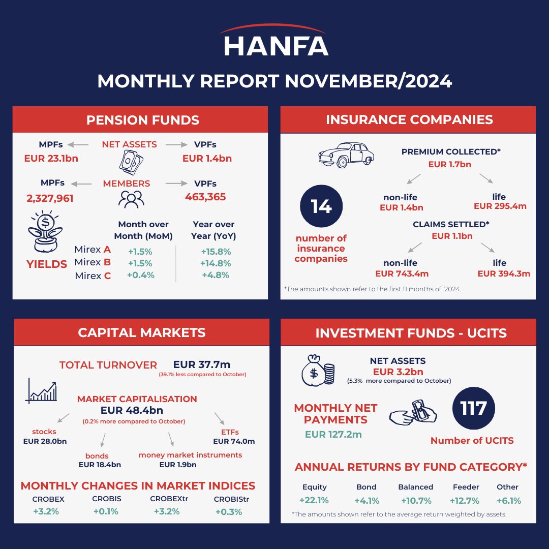 In November 2024, there were 117 UCITS operating on the market. Total net assets of UCITS amounted to EUR 3.2bn at the end of the month, increasing by EUR 160.5m or 5.3% compared to the previous month. Total monthly payments of all UCITS in November were positive, amounting to EUR 127.2m. Positive net payments were recorded by all fund types, namely: money market funds (EUR 82.1m), “other” funds (EUR 33.0m), equity funds (EUR 7.1m), balanced funds (EUR 2.3m), bond funds (EUR 2.0m) and feeder funds (HRK 0.7m). Bond funds’ net assets accounted for 27.0% of all UCITS’ net assets at the end of November, funds categorised as “other” accounted for 25.0%, while equity and balanced funds accounted for 16.0% and 9.1% of the total UCITS’ net assets respectively. In November 2024, all fund categories recorded positive asset-weighted average monthly returns, namely: feeder funds (2.6 %), balanced funds (2.2%), equity funds (0.8%), “other” funds (0.7%), bond funds (0.3%) and money market funds (0.2%). At the end of November 2024, the asset-weighted average annual returns stood at 22.1% for equity funds, 12.7% for feeder funds, 10.7% for balanced funds, 6.1% for “other” funds and 4.1% for bond funds.