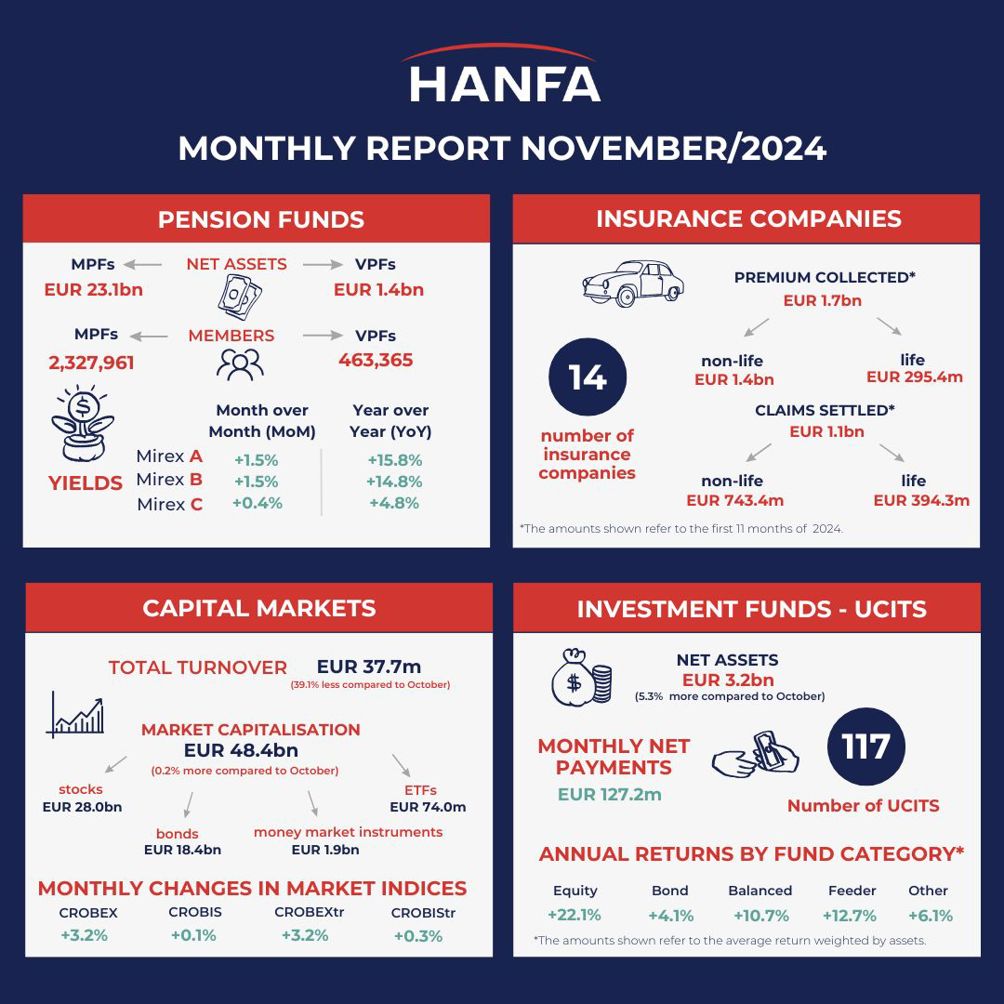 Net assets of the Fund for Croatian Homeland War Veterans and Members of their Families amounted to EUR 213.4m at the end of November (an 8.9% monthly increase), with the monthly return of the fund reaching 9.1%.