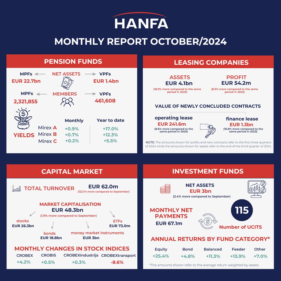 In October 2024, there were 115 UCITS operating on the market. Total net assets of UCITS amounted to EUR 3.0bn at the end of the month, increasing by EUR 72.4m or 2.4% compared to the previous month. Total monthly payments of all UCITS in October were positive, amounting to EUR 67.1m. Positive net payments were recorded by money market funds (EUR 45.3m), bond funds (EUR 19.1m), equity funds (EUR 5.2m), balanced funds (EUR 0.04m), and feeder funds (HRK 0.009m). Negative net payments were recorded by funds categorised as “other” (EUR -2.6m). Bond funds’ net assets accounted for 28.2% of the total net assets of all UCITS at the end of October, funds categorised as “other” accounted for 25.6%, while equity and balanced funds accounted for 16.4% and 9.3% of the total UCITS’ net assets respectively. In October 2024, positive asset-weighted average monthly returns were recorded only by money market funds (0.2%), while negative asset-weighted average monthly returns were recorded by: equity funds (-0.2%), balanced funds (-0.3%), bond funds (-0.4%), funds categorised as “other” (-0.4%) and feeder funds (-0.4%). At the end of October 2024, the asset-weighted average annual returns stood at 25.4% for equity funds, 13.9% for feeder funds, 11.3% for balanced funds, 7.0% for funds categorised as “other" and 4.8% for bond funds. Net assets of the Fund for Croatian Homeland War Veterans and Members of their Families amounted to EUR 196.0m at the end of October, (an 8.9% monthly increase), with the monthly return of the fund reaching 9.0%.