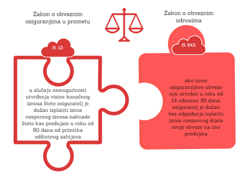 Prilikom obrade odštetnog zahtjeva društva za osiguranje moraju u slučajevima kada je osnovanost zahtjeva nesporna, ali je za njegovu cjelovitu obradu i utvrđivanje konačne visine štete potrebno stanovito dulje vrijeme u odnosu na zakonske rokove, ili kada se ne postigne nagodba s podnositeljem odštetnog zahtjeva isplatiti nesporni dio štete kao svojevrsni predujam.