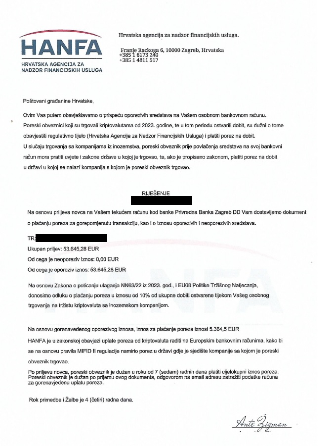 U takvoj se situaciji našla građanka koja je uputila pritužbu Hanfi. Ona je dobila dopis na fiktivnom memorandumu Hanfe s potpisom predsjednika Upravnog vijeća, u kojem ju se obavještava o tzv. dospijeću oporezivih sredstava na njezin osobni bankovni račun te se od nje traži uplata poreza kako bi mogla povući ta sredstva. U dopisu se navodi IBAN njezina računa u banci u Hrvatskoj, opisuju se različite regulative na osnovi kojih bi trebala uplatiti porez u iznosu od 10 % od ukupne dobiti ostvarene tijekom trgovanja na tržištu kriptovaluta s inozemnim društvom te se poziva da pošalje e-mail kako bi dobila podatke banke za uplatu spomenutog iznosa poreza. Nakon odgovora na dopis dobila je upute oko uplate poreza u banci sa sjedištem u Poljskoj, kojoj je spomenuti iznos nažalost i uplatila.
