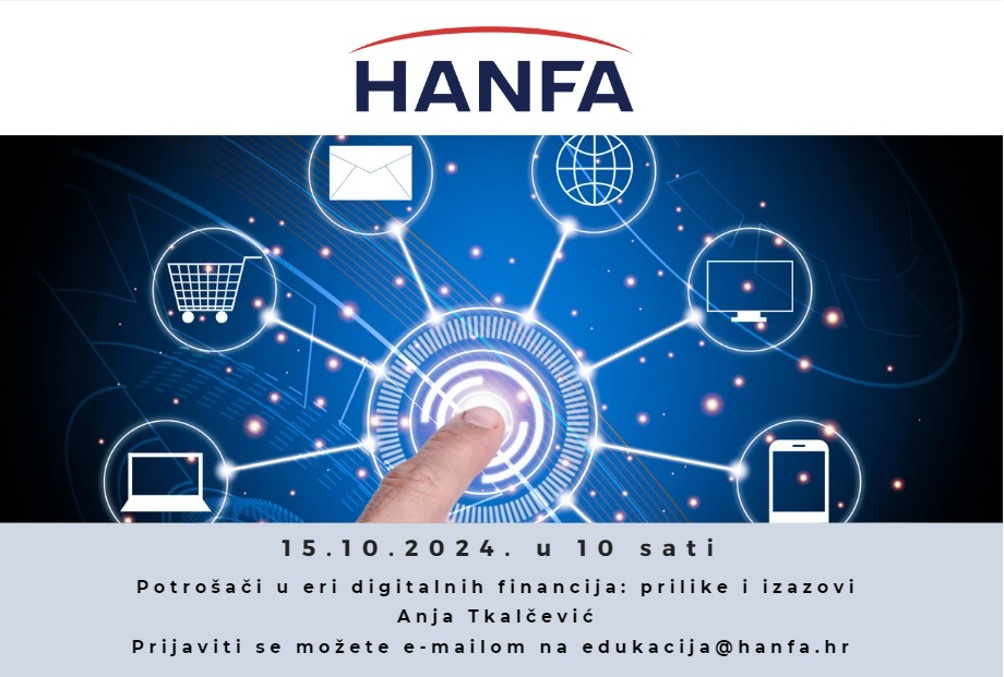 Digitalne financijske usluge, njihove prednosti i nedostaci tema su novog edukativnog predavanja Hanfe. Predavanje će se održati 15. listopada s početkom u 10 sati, a prisustvovati mogu svi zainteresirani. Za ovo besplatno predavanje potrebno je izvršiti prijavu na e-mail: edukacija@hanfa.hr, nakon čega će stići odgovor s uputom za online praćenje predavanja.