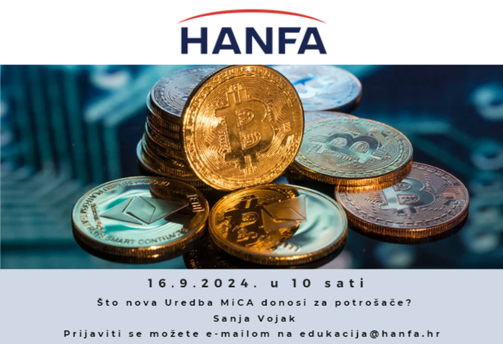 Serijal jesenskih online predavanja započinjemo temom: „Što nova Uredba MiCA donosi za potrošače?“. Predavanje će se održati 16. rujna 2024. s početkom u 10 sati, a prisustvovati mogu svi zainteresirani. Za ovo besplatno predavanje potrebno je izvršiti prijavu na e-mail: edukacija@hanfa.hr, nakon čega će stići odgovor s uputom za online praćenje predavanja.