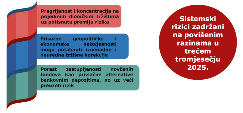 Razina sistemskih rizika u sektoru financijskih usluga ostala je povišena u trećem tromjesečju 2025. godine. Iako se makroekonomski uvjeti u tom razdoblju nisu bitno promijenili te je gospodarstvo nastavilo rasti, glavni izvori rizika i dalje su povišeni inflacijski pritisci i nastavak rasta cijena na tržištu nekretnina.