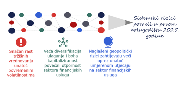 U prvom polugodištu 2025. razina sistemskih rizika u sektoru financijskih usluga ostala je povišena, unatoč nastavku gospodarskog rasta i stabilnim fiskalnim izgledima. Glavni izvori rizika i dalje su povišeni inflacijski pritisci i nastavak rasta cijena na tržištu nekretnina, koji povećavaju ranjivost makroekonomskog okružja.