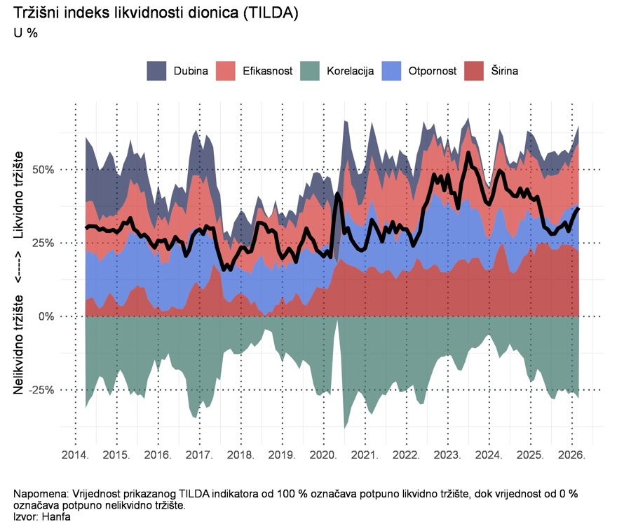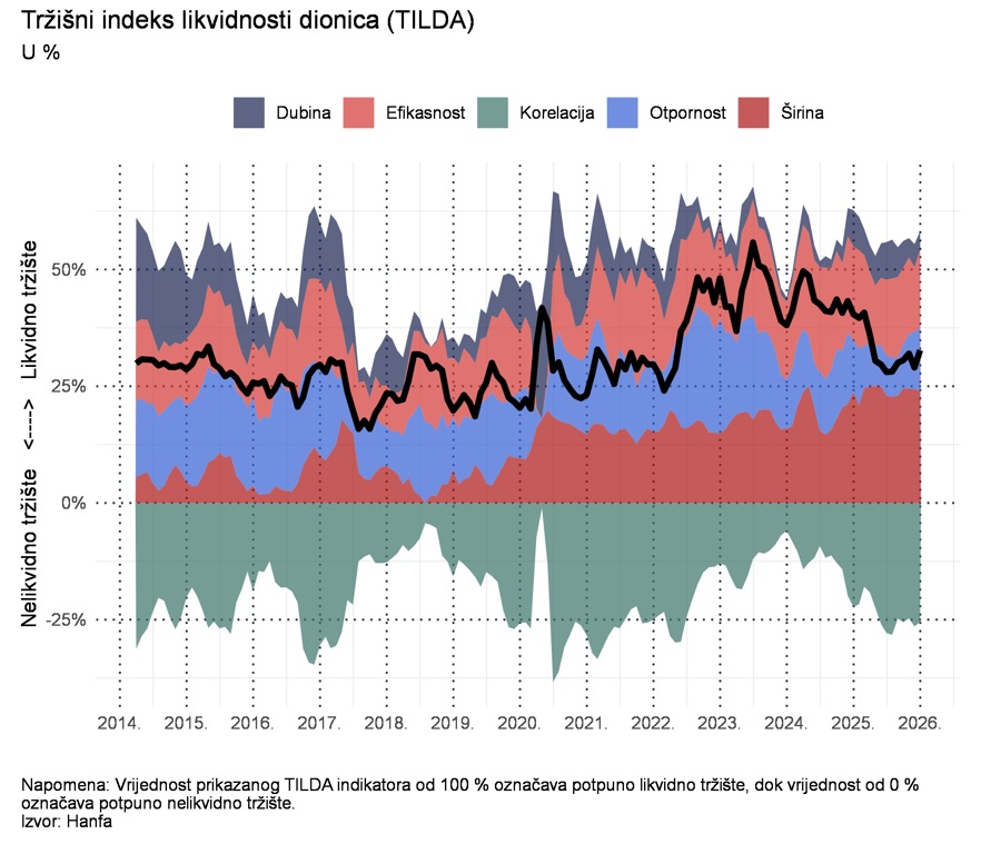 Financijski sustav centralni je dio gospodarstva čija uloga financijskog posredništva od štediša (institucija i pojedinaca s neto viškom financijskih sredstava) prema dužnicima (novčano deficitarni ekonomski agenti) potpomaže gospodarski rast i razvoj kroz efikasnu alokaciju kapitala prema aktivnostima koje stvaraju dodatnu vrijednost. Strukturni pokazatelji tržišta kapitala posebno su važni za ulagatelje, ali i regulatore jer upućuju na snagu tržišta da podnese iznenadne sistemske šokove. Iako je pojam likvidnosti tržišta kapitala u teoriji intuitivan i lako razumljiv, u praksi se ispod krovnog pojma tržišne likvidnosti krije nekoliko različitih koncepata, odnosno karakteristika tržišta. Likvidnost domaćeg tržišta kapitala moguće je analizirati praćenjem kompozitnoga tržišnog indikatora likvidnosti domaćeg dioničkog tržišta (TILDA).