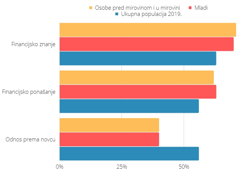 Ukupna ocjena financijske pismenosti građana u dobi od 50 do 65 godina iznosila je 12,2 od maksimalnih 20 bodova. To pokazuje kako su ispitanici u prosjeku dali točan, odnosno poželjan odgovor na ukupno 61 % postavljenih pitanja, što je za 2 postotna boda više od financijske pismenosti svih punoljetnih građana Hrvatske prema ispitivanju OECD-a iz 2019. Životno iskustvo ispitanika reflektira se u ostvarenom visokom rezultatu njihova financijskog znanja i poznavanja temeljnih financijskih pojmova i usluga (71 %). No visoko teorijsko poznavanje svijeta financija nije praćeno jednako visokim i odgovornim financijskim ponašanjem (62 %) te odnosom prema novcu (40 %), a slični se odnosi uočavaju i kada je riječ o ukupnoj populaciji (slika 1.). Relativno niska ocjena razine financijskog ponašanja u odnosu na znanje može se objasniti činjenicom da na financijsko ponašanje utječe i financijska situacija pojedinca. Tako primjerice, unatoč tome što čak 62 % ispitanika planira svoj mjesečni budžet, a visokih 78 % ih prije kupnje razmisli može li si priuštiti određeni proizvod ili uslugu, čak 44 % ispitanika nije otporno na financijske šokove te ne bi moglo pokriti nenadani trošak u visini mjesečnih primanja. Stoga je važno naglasiti kako ti rezultati ne odražavaju samo subjektivnu percepciju novca i upravljanja financijama, već i objektivne okolnosti, ponajprije u vidu nedostatne razine prosječnog dohotka u mirovini u visini od tek oko 40 % prosječne plaće, koja onemogućava umirovljenicima da primjerenije upravljaju svojim financijama kroz npr. aktivnu štednju i osiguravanje financijske otpornosti na šokove.