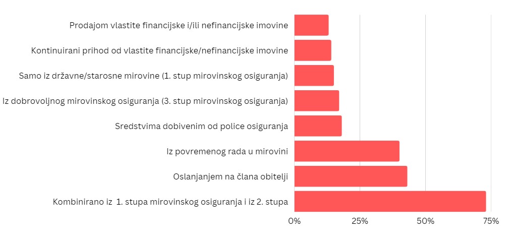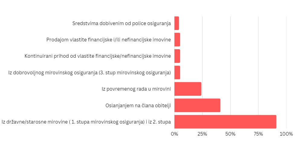 I osobe koje su još u fazi planiranja i štednje za mirovinu također u nedovoljnoj mjeri razmišljaju o drugim izvorima prihoda pored obveznog mirovinskog osiguranja. Navedeno je posebno zanimljivo s obzirom na to da najveći broj ispitanika smatra da bi im mjesečna primanja nakon umirovljenja za ugodan život trebala iznositi između 5 000 i 7 000 kuna[3], što je gotovo dvostruko veći iznos od trenutačne prosječne mirovine. Navedena razlika između mirovinskih prihoda i iznosa ugodnog za život u mirovini jedan je od razloga zbog kojeg čak 40 % osoba koje su pred mirovinom planira nastaviti raditi i nakon umirovljenja. Osim povremenog rada u mirovini, 43 % ispitanika planira se dodatno financijski osloniti i na nekog člana obitelji, a što je povezano i s činjenicom da njih čak 64 % smatra kako neće imati dostatni iznos mirovine iz formalnih izvora za primjeren život, a 40 % ih smatra kako će u mirovini ovisiti ili već ovisi o tuđoj pomoći.