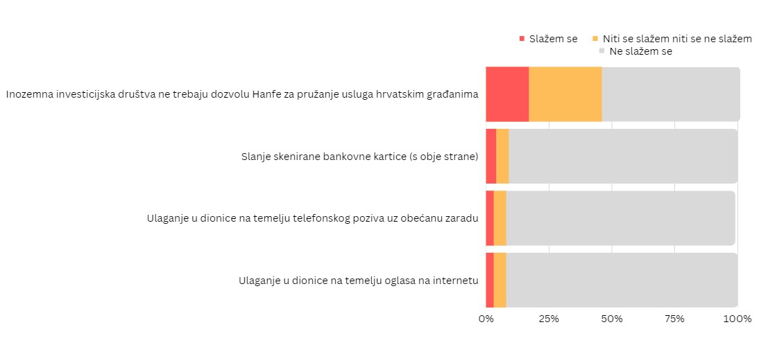 Stoga je izuzetno važno upozoravati i informirati građane o vrstama i oblicima prijevara te znakovima koji na njih ukazuju. Hanfa je do sada objavila niz upozorenja i edukativnih materijala povezanih s financijskim prijevarama. Građane je važno informirati i o tome kome se mogu obratiti u slučaju da su bili žrtvom financijske prijevare ili su imali prijepore s društvima s obzirom na to da više od polovice ispitanika nije sigurno kome treba podnijeti žalbu u slučaju prijepora s institucijom koja im pruža neku financijsku uslugu.