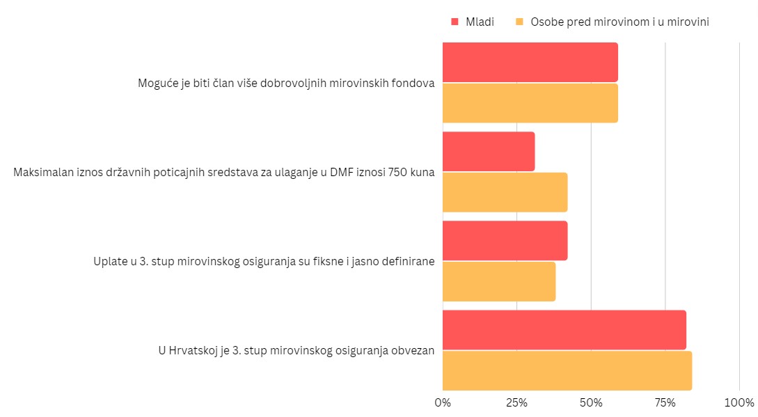 Tek se manji dio građana pri planiranju mirovine oslanja na druge mogućnosti štednje za mirovinu, ponajprije na dobrovoljnu mirovinsku štednju. Iako vrlo visoki udio građana (84 %) zna da postoji dodatni treći mirovinski stup i da je on dobrovoljan, njih 43 % koji su u fazi planiranja mirovne uplaćuje dobrovoljnu mirovinsku štednju ili to za njih čini poslodavac. Najveći dio osoba koje štede u trećem stupu mjesečno izdvaja između 400 i 600 kn[4], koliko je potrebno za ostvarivanje punog iznosa državnih poticajnih sredstava. Posljedica je to vjerojatno i nedovoljne upoznatosti s karakteristikama trećeg stupa, kao što je primjerice fleksibilnost uplata. Naime, iako su osobe pred mirovinom i u mirovini bolje upoznate s državnim poticajnim sredstvima na dobrovoljnu mirovinsku štednju u odnosu na mlade, i dalje njih više od 50 % ne zna koji je maksimalan iznos tih poticaja.
