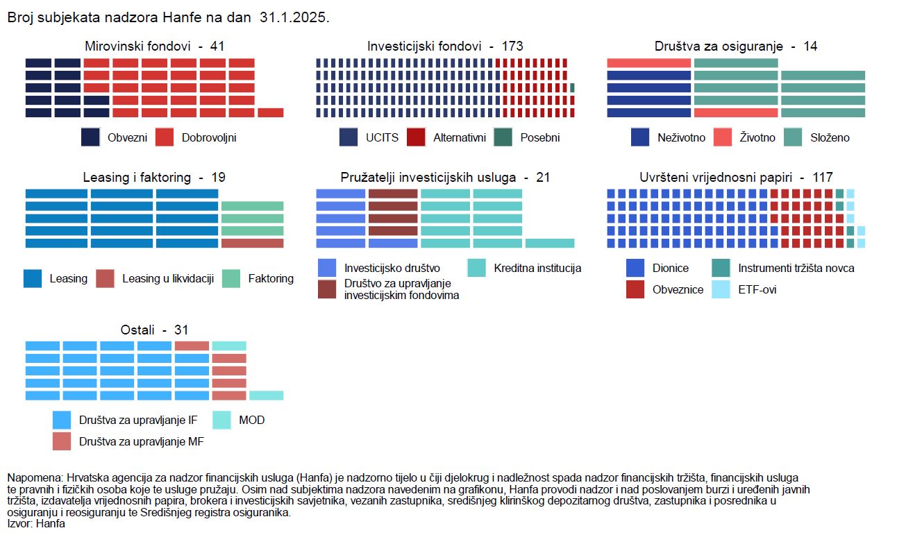 Hrvatska agencija za nadzor financijskih usluga (Hanfa) predstavlja novi izgled statističke publikacije Mjesečni pregled sektora financijskih usluga s ciljem poboljšanja dostupnosti i veće transparentnosti relevantnih tržišta. Ta publikacija na jednom mjestu daje grafički prikaz ključnih kretanja u sektorima pod nadležnošću Hanfe omogućavajući jasnije i lakše tumačenje podataka i usporedbu različitih vremenskih razdoblja i tržišnih segmenata.