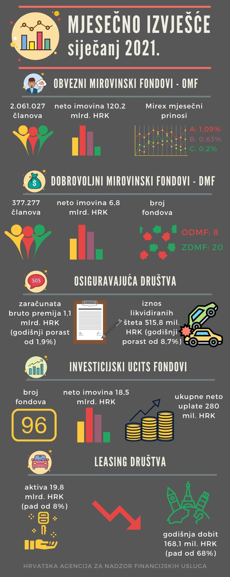 Neto imovina OMF-ova u siječnju 2021. iznosila je 120,2 mlrd. HRK te se u odnosu na prethodni mjesec povećala za 1 %. Mjesečni prinosi Mirexa u siječnju 2021. iznosili su 1,1 % za kategoriju A, 0,6 % za kategoriju B i 0,2 % za kategoriju C. Godišnji prinosi Mirexa zadržali su pozitivan predznak i kretali su se od 1,1 % do 1,2 %. Anualizirani prinosi Mirexa od početka rada OMF-ova iznose za Mirex A 7,0 %, za Mirex B 5,4 % i za Mirex C 5,1 %. Obveznice su na kraju siječnja bile dominantan oblik ulaganja u strukturi OMF-ova s udjelom od 67,2%, dok su istovremeno ulaganja u dionice činile 18,6%. Od ostalih oblika ulaganja najzastupljenija su ulaganja u investicijske fondove s udjelom od 9,4 % na razini svih OMF-ova.