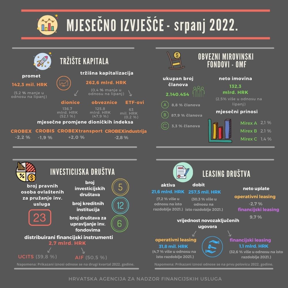 Ukupni promet na Zagrebačkoj burzi u srpnju 2022. iznosio je 142,3 mil. HRK, što predstavlja pad od 5,2 % na mjesečnoj razini. Tržišna kapitalizacija neznatno se smanjila (za 0,4 %) u odnosu na prethodni mjesec i iznosila je 262,6 mlrd. HRK, od čega su 136,7 mlrd. HRK činile dionice, 125,8 mlrd. HRK obveznice, a 63 mil. HRK ETF-ovi. Kod dioničkih indeksa najveći mjesečni rast od 2,0 % ostvario je CROBEXtransport, dok je najveći mjesečni pad zabilježio CROBEXindustrija (-2,8 %). Mjesečni pad zabilježili su i glavni dionički indeksi Zagrebačke burze CROBEX (-2,2 %) i CROBEX10 (-1,9 %), kao i obveznički indeksi CROBIS (-1,9 %) i CROBIStr (-1,7 %). Dionica kojom se u srpnju najviše trgovalo bila je dionica društva Atlantska plovidba d.d., kojom je ostvaren promet od 12,2 mil. HRK (12,2 % ukupnog trgovanja na burzi u srpnju), a čija je vrijednost ostvarila mjesečni pad od 4,9 %.