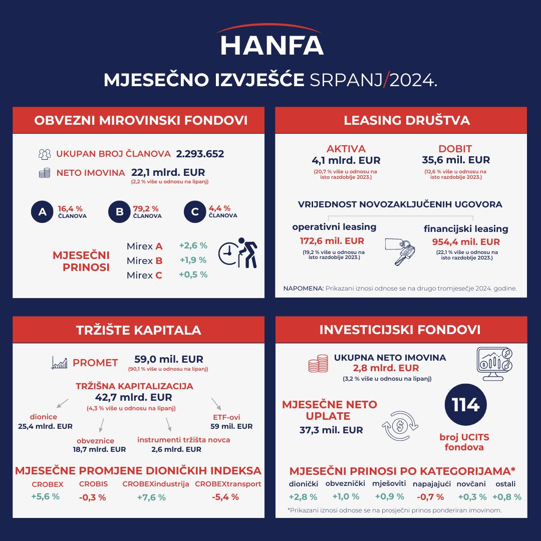 Neto imovina OMF-ova na kraju srpnja 2024. iznosila je 22,1 mlrd. EUR, što je za 0,5 mlrd. EUR (2,2 %) više u odnosu na prethodni mjesec. Na kraju srpnja nominalni mjesečni prinosi Mirexa iznosili su 2,6 % za kategoriju A, 1,9 % za kategoriju B i 0,5 % za kategoriju C. Godišnji prinosi Mirexa iznosili su 13,8 % za kategoriju A, 10,4 % za kategoriju B i 4,3 % za kategoriju C. Prinosi od početka godine iznosili su 9,3 % za kategoriju A, 6,5 % za kategoriju B i 1,5 % za kategoriju C, a anualizirani[1] prinosi od početka rada OMF-ova iznosili su 7,7 % za Mirex A, 5,4 % za Mirex B i 3,3 % za Mirex C[2].
