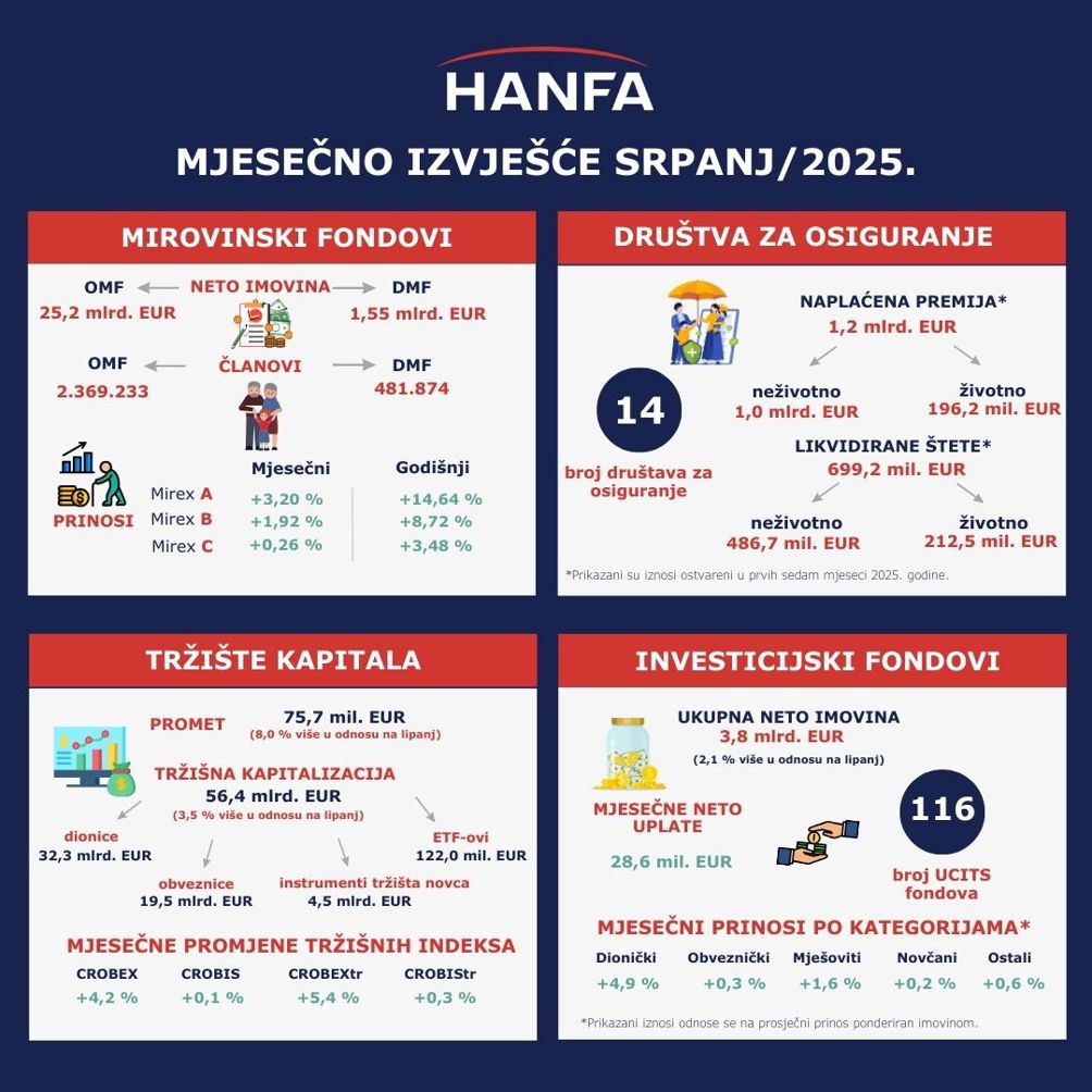 Na kraju srpnja 2025. broj članova 8 otvorenih dobrovoljnih mirovinskih fondova (ODMF) povećao se za 0,5 % na mjesečnoj razini, a broj članova 21 zatvorenog dobrovoljnog mirovinskog fonda (ZDMF) za 0,02 % te su spomenuti fondovi imali 431.619 (ODMF) odnosno 50.255 članova (ZDMF). Ukupne uplate u dobrovoljne mirovinske fondove (DMF) u srpnju 2025. iznosile su 11,6 mil. EUR (0,8 % neto imovine s kraja prethodnog mjeseca), što je za 12,4 % više u odnosu na prethodni mjesec. Ukupne isplate iz DMF-ova u srpnju 2025. iznosile su 4,3 mil. EUR, što je na mjesečnoj razini manje za 3,7 %. Isplate zbog umirovljenja i ostalih razloga činile su 68,9 %, isplate zbog promjene fonda 25,0 %, a isplate zbog smrti 6,2 % ukupnih isplata u srpnju. Kod ukupnih isplata zbog umirovljenja 1,7 mil. EUR isplaćeno je putem društva (fonda), 0,9 mil. EUR u obliku jednokratnih isplata, a 0,4 mil. EUR transferirano je u mirovinska osiguravajuća društva (MOD-ove). Neto imovina DMF-ova u srpnju povećala se za 35,3 mil. EUR (2,3 % na mjesečnoj razini) te je iznosila 1,55 mlrd. EUR. Mjesečni nominalni prinosi DMF-ova u srpnju su se kretali između 0,2 % i 3,6 %, a prinosi na godišnjoj razini od 2,4 % do 13,1 %. Kod strukture ulaganja DMF-ova najveći dio portfelja čine obveznice (53,1 % imovine), a zatim dionice (27,3 %) te investicijski fondovi (10,4 %). Udio obveznica u ulaganjima DMF-ova smanjio se na mjesečnoj razini za 0,4 p.b., a porastao je udio dionica (za 0,8 p.b.) i udio ulaganja u investicijske fondove (za 0,3 p.b.).