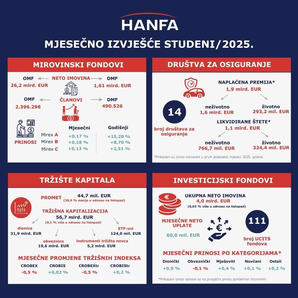 Na kraju studenoga 2025. broj članova 8 otvorenih dobrovoljnih mirovinskih fondova (ODMF) povećao se za 0,5 % na mjesečnoj razini, a broj članova 21 zatvorenog dobrovoljnog mirovinskog fonda (ZDMF) također za 0,5 % te su spomenuti fondovi imali 439.866 (ODMF) odnosno 50.660 članova (ZDMF). Ukupne uplate u dobrovoljne mirovinske fondove (DMF) u studenome 2025. iznosile su 14,0 mil. EUR (0,9 % neto imovine s kraja prethodnog mjeseca), što je za 16,3 % više u odnosu na prethodni mjesec. Ukupne isplate iz DMF-ova iznosile su 4,5 mil. EUR, što je na mjesečnoj razini manje za 21,8 %. Isplate zbog umirovljenja i ostalih razloga činile su 68,3 %, isplate zbog promjene fonda 25,8 %, a isplate zbog smrti 5,9 % ukupnih isplata u studenome. Kod ukupnih isplata zbog umirovljenja 1,7 mil. EUR isplaćeno je putem društva (fonda), 0,9 mil. EUR u obliku jednokratnih isplata, a 0,5 mil. EUR transferirano je u mirovinska osiguravajuća društva (MOD-ove). Neto imovina DMF-ova u studenome povećala se za 11,3 mil. EUR (0,7 % na mjesečnoj razini) te je iznosila 1,61 mlrd. EUR. Mjesečni nominalni prinosi DMF-ova kretali su se između -0,7 % i 0,5 %, a prinosi na godišnjoj razini od 2,0 % do 14,4 %. Kod strukture ulaganja DMF-ova najveći dio portfelja čine obveznice (53,5 % imovine), a zatim dionice (27,9 %) te investicijski fondovi (9,4 %). Na mjesečnoj razini u ulaganjima se povećao udio obveznica (za 0,4 p.b.) i udio dionica (za 0,03 p.b.), a smanjio se udio ulaganja u investicijske fondove (za 1,3 p.b.).