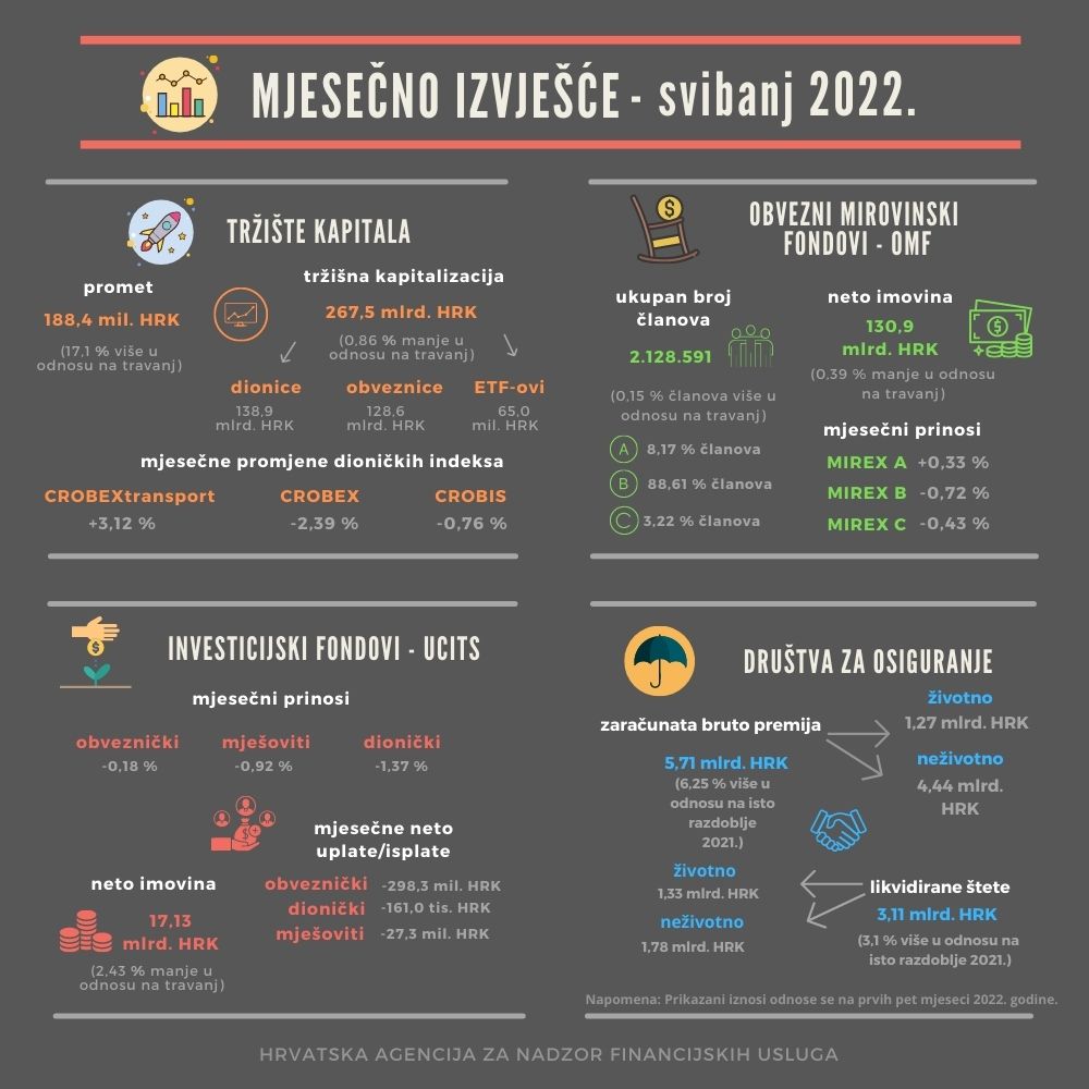 Ukupni promet na Zagrebačkoj burzi u svibnju 2022. iznosio je 188,4 mil. HRK, što predstavlja rast od 17,1 % na mjesečnoj razini. Tržišna kapitalizacija neznatno se smanjila (za 0,86 %) u odnosu na prethodni mjesec i iznosila je 267,5 mlrd. HRK, od čega su 138,9 mlrd. HRK činile dionice, 128,6 mlrd. HRK obveznice, a 65 mil. HRK ETF-ovi. Kod dioničkih indeksa najveći mjesečni rast od 3,12 % ostvario je CROBEXtransport, dok je najveći mjesečni pad zabilježio CROBEX10 (-3,25 %). Mjesečni pad zabilježio je i glavni dionički indeks Zagrebačke burze CROBEX (-2,39 %), kao i obveznički indeksi CROBIS (-0,76%) i CROBIStr (-0,56 %). Dionica kojom se u svibnju najviše trgovalo bila je ponovno dionica Valamar Riviera d.d., kojom je ostvaren promet od 22,13 mil. HRK (14,36 % ukupnog trgovanja na burzi u svibnju), a čija je vrijednost ostvarila mjesečni pad od 7,43 %.