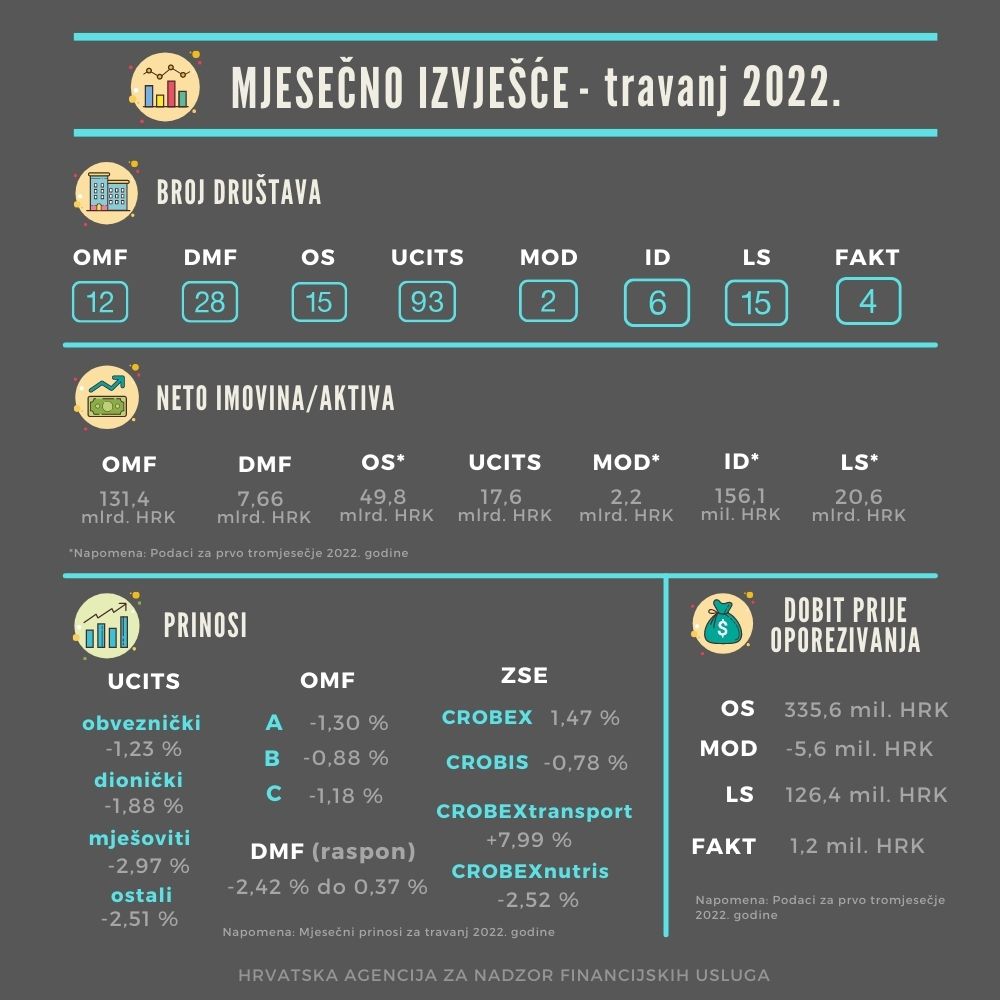 U travnju 2022. poslovala su ukupno 93 UCITS fonda, dva manje nego u prethodnom mjesecu jer je jedan obveznički fond otišao u likvidaciju, a drugi obveznički fond pripojen je jednom napajajućem fondu. Ukupna neto imovina UCITS fondova na kraju mjeseca iznosila je 17,56 mlrd. HRK te je bila za 0,52 mlrd. HRK ili 2,87 % manja u odnosu na prethodni mjesec. U travnju je usporen trend negativnih mjesečnih neto uplata, koji su i dalje ostali u minusu (-256,6 mil. HRK), primarno zbog negativnih neto uplata obvezničkih UCITS fondova (-340,4 mil. HRK). Pozitivne mjesečne neto uplate ostvarili su dionički fondovi (34,5 mil. HRK), mješoviti fondovi (16,1 mil. HRK), napajajući fondovi (15,4 mil. HRK) te fondovi iz kategorije „ostali“ (17,9 mil. HRK). Neto imovina obvezničkih fondova na kraju travnja činila je 67,1 % ukupne neto imovine svih UCITS fondova, dok su dionički i mješoviti fondovi činili 12,7 %, odnosno 7,1 % ukupne neto imovine UCITS fondova. Što se tiče prosječnog mjesečnog prinosa ponderiranog imovinom, sve vrste UCITS fondova zadržale su negativan mjesečni prinos i to: napajajući -2,02 %, dionički -1,88 %, mješoviti -2,97 %, ostali -2,51 % i obveznički -1,23 %.
